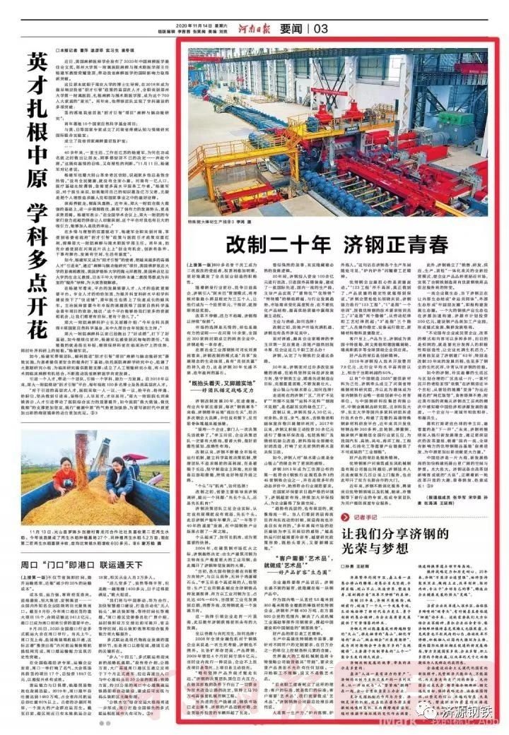 《河南日報》頭版:改制二十年 濟鋼正青春